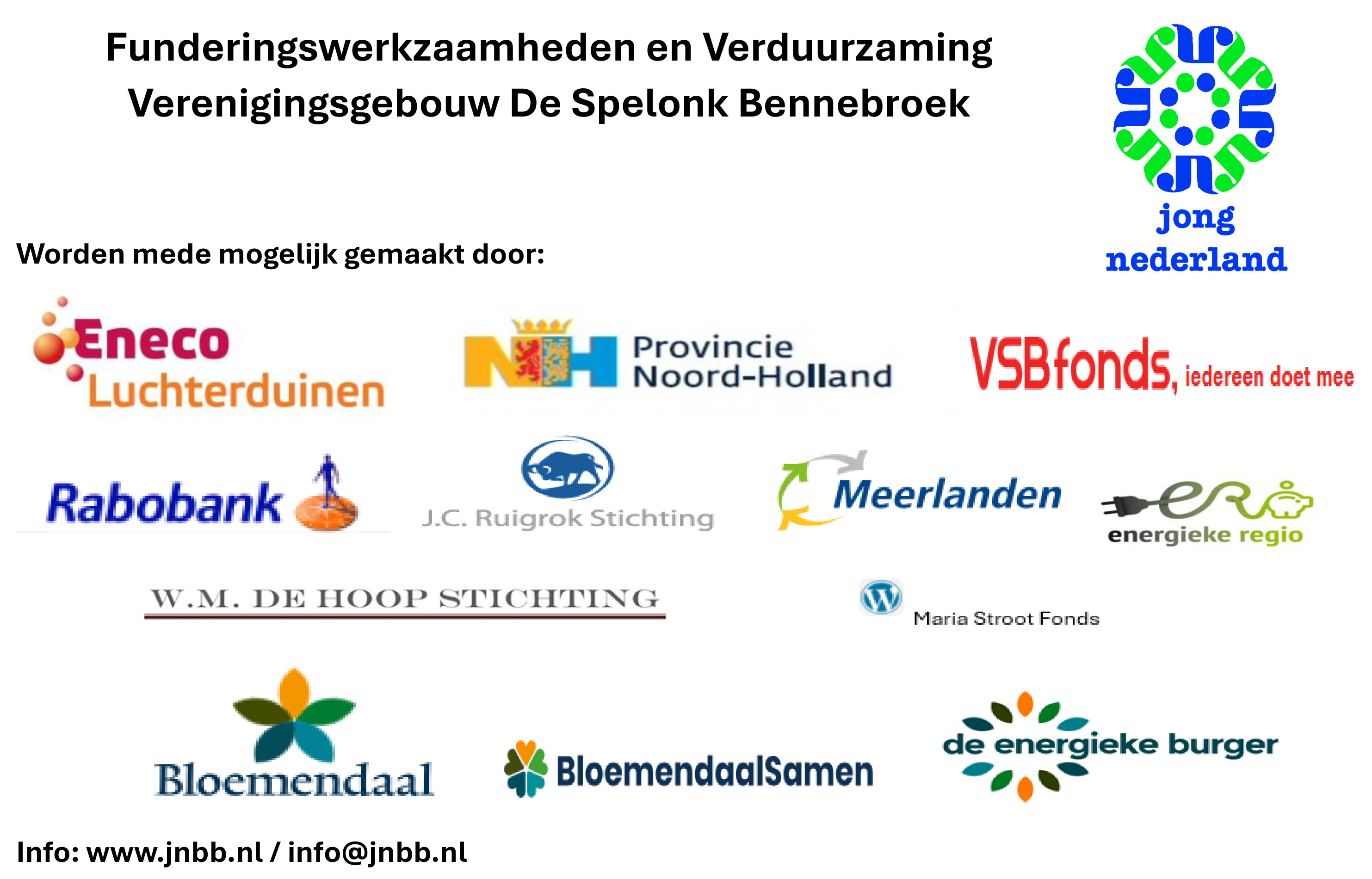 Jong Nederland Bennebroek organiseert al meer dan 55 jaar diverse activiteiten voor jongeren, waaronder speldagen, creatieve middagen en tentenkampweken. Deze activiteiten worden georganiseerd vanuit Verenigingsgebouw De Spelonk, gelegen aan de Schoollaan 98A, 2121GJ Bennebroek, in de gemeente Bloemendaal. Naast jeugdactiviteiten wordt deze locatie ook gebruikt voor sportactiviteiten voor ouderen, cursussen, vergaderingen en andere bijeenkomsten. Er zijn aanpassingen aan de fundering van het verenigingsgebouw noodzakelijk.